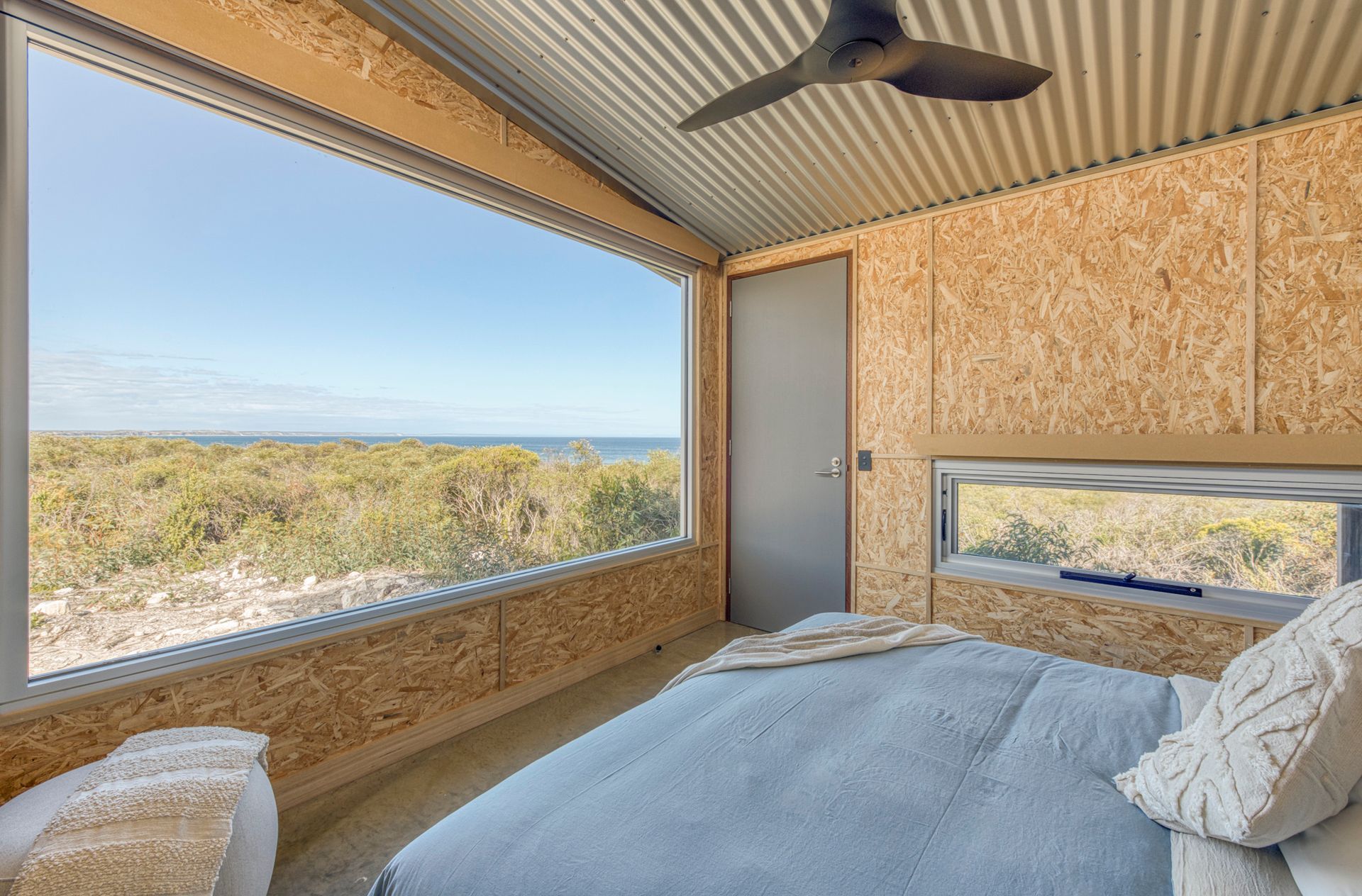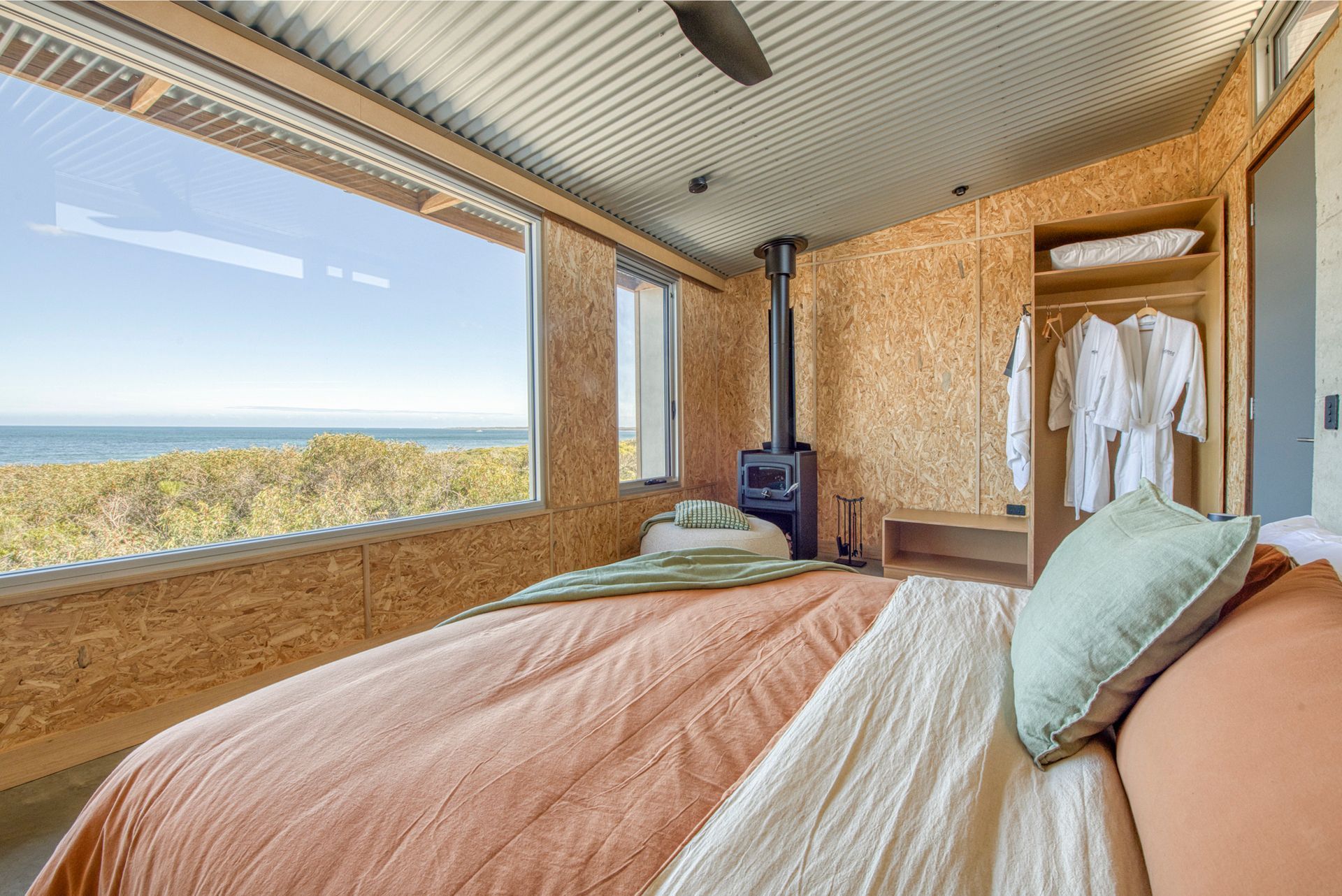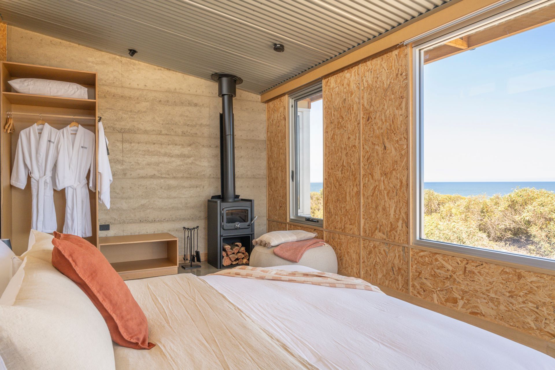 A slightly smaller room, this room has the only architecturally designed panoramic window. Purpose built to soak up the Southern Ocean from laying in bed. With the addition of huge window facing the North Eastern Headland glamor view.