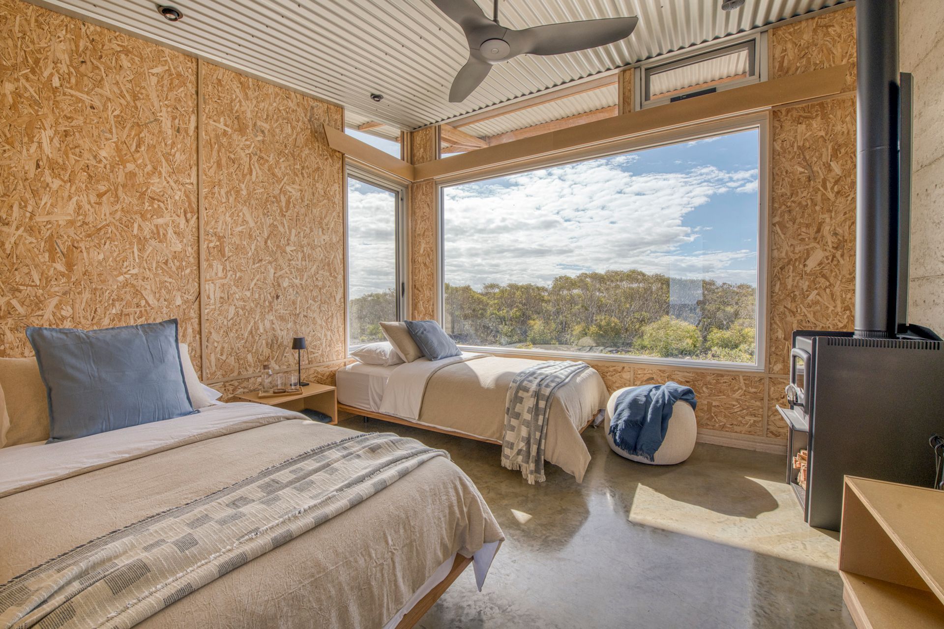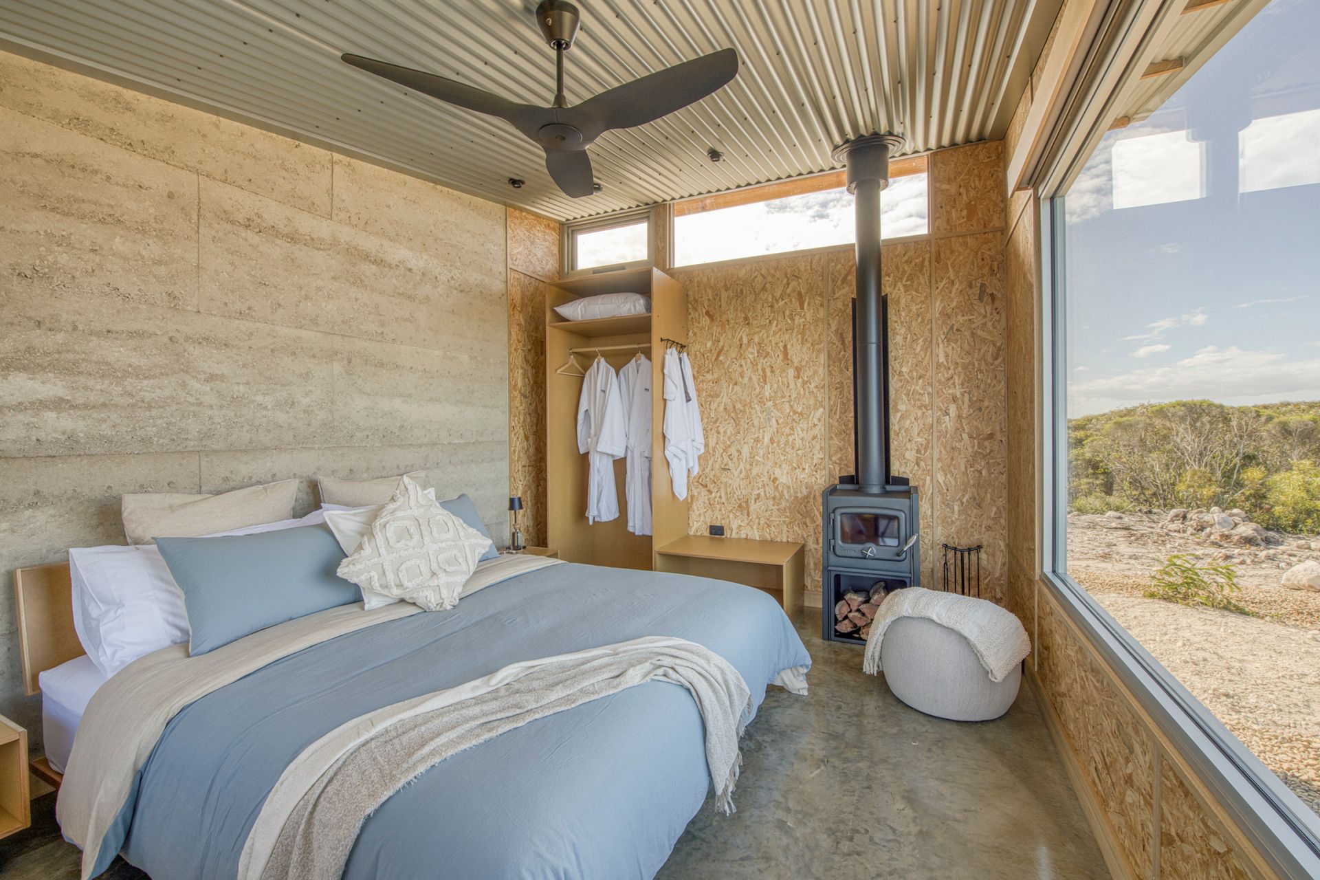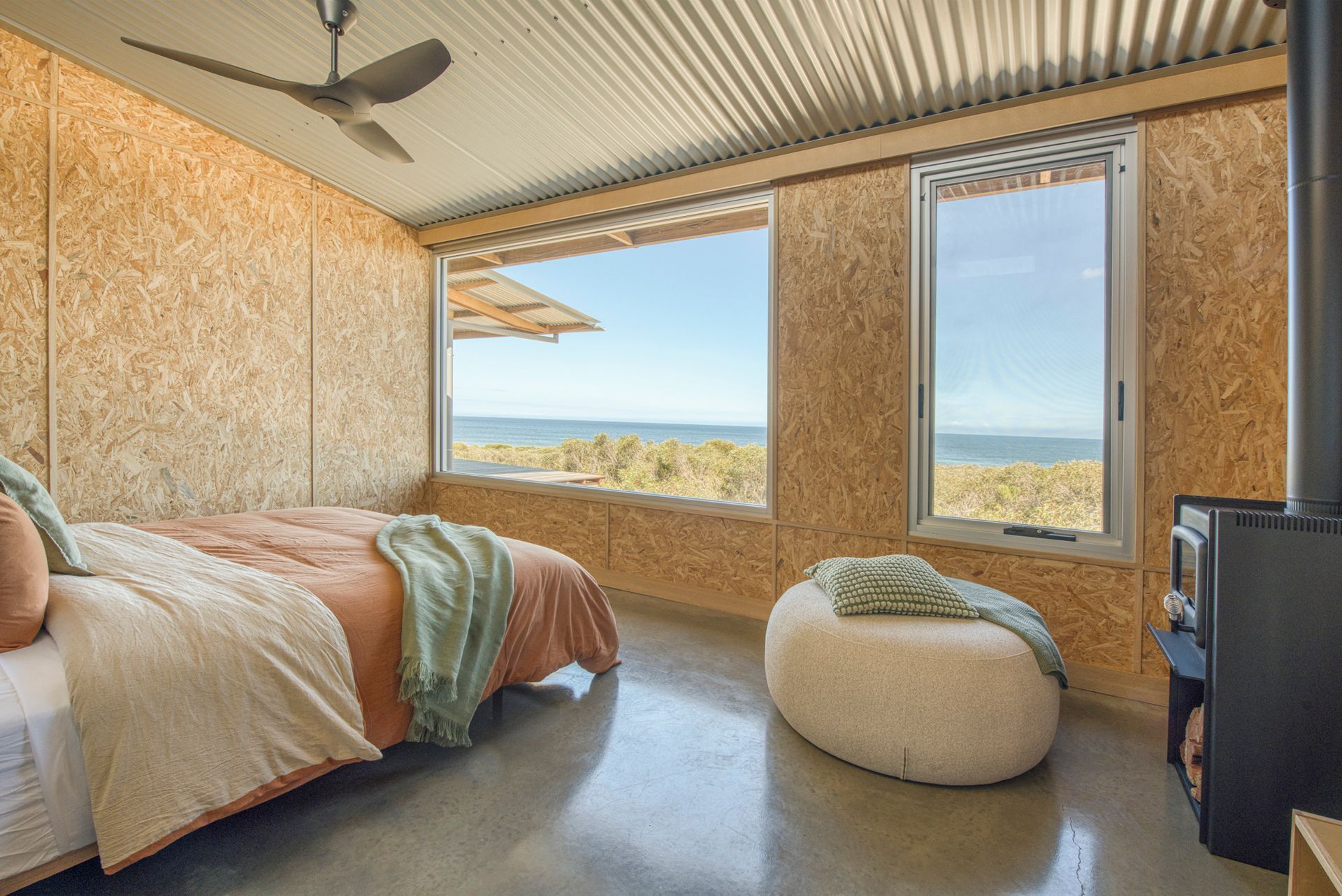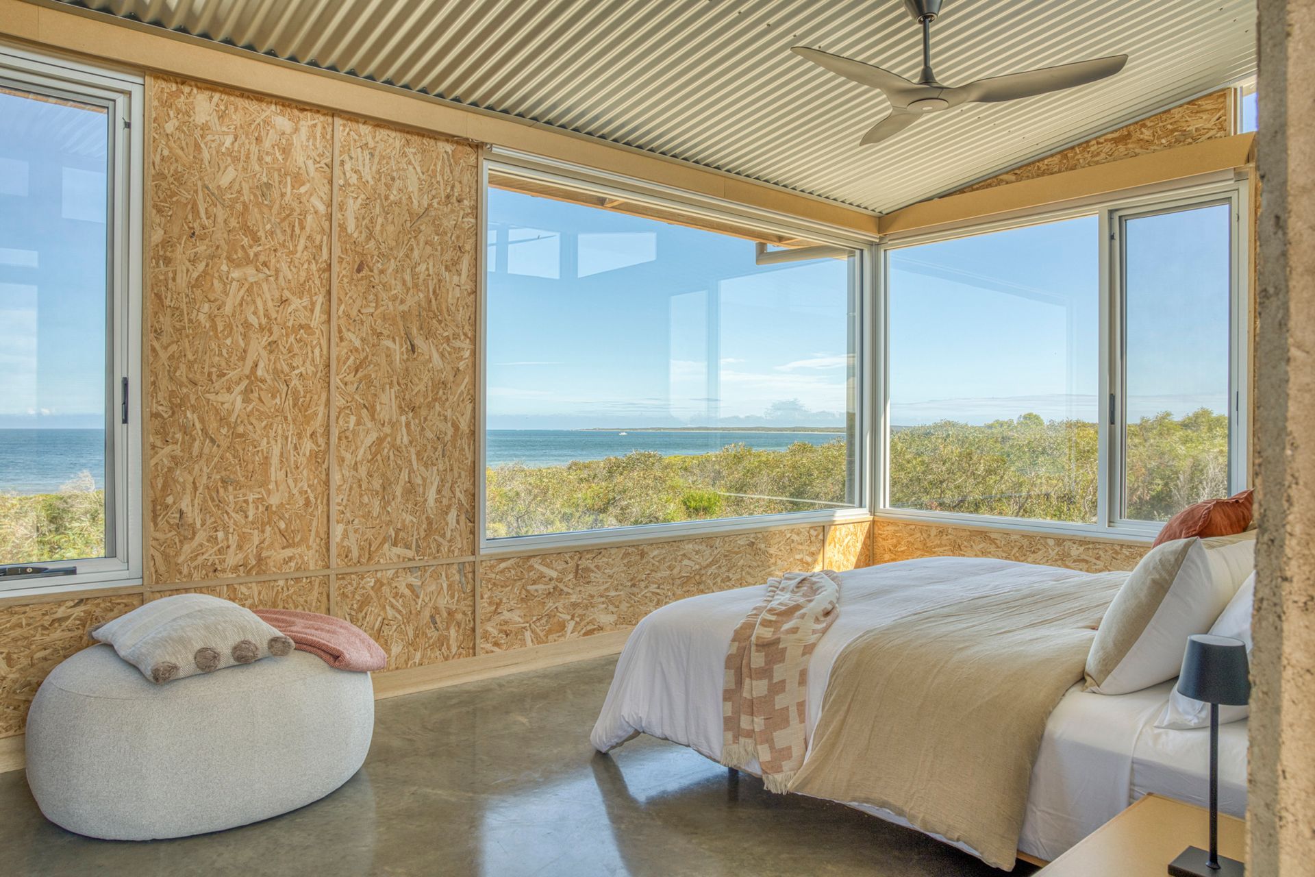 A slightly smaller room, this room has the only architecturally designed panoramic window. Purpose built to soak up the Southern Ocean from laying in bed. With the addition of huge window facing the North Eastern Headland glamor view.