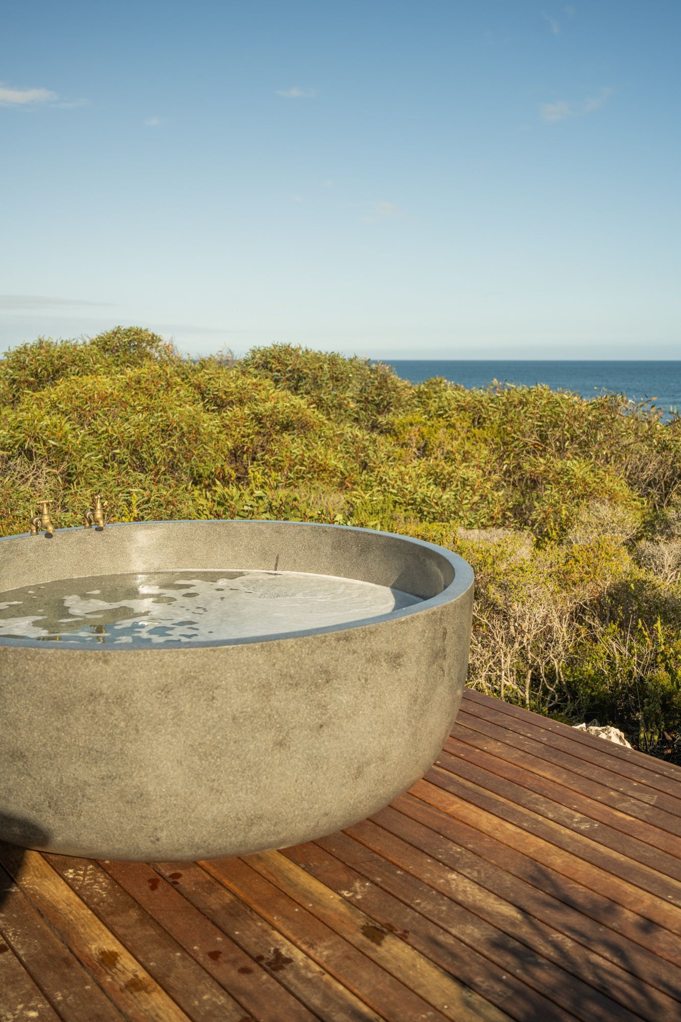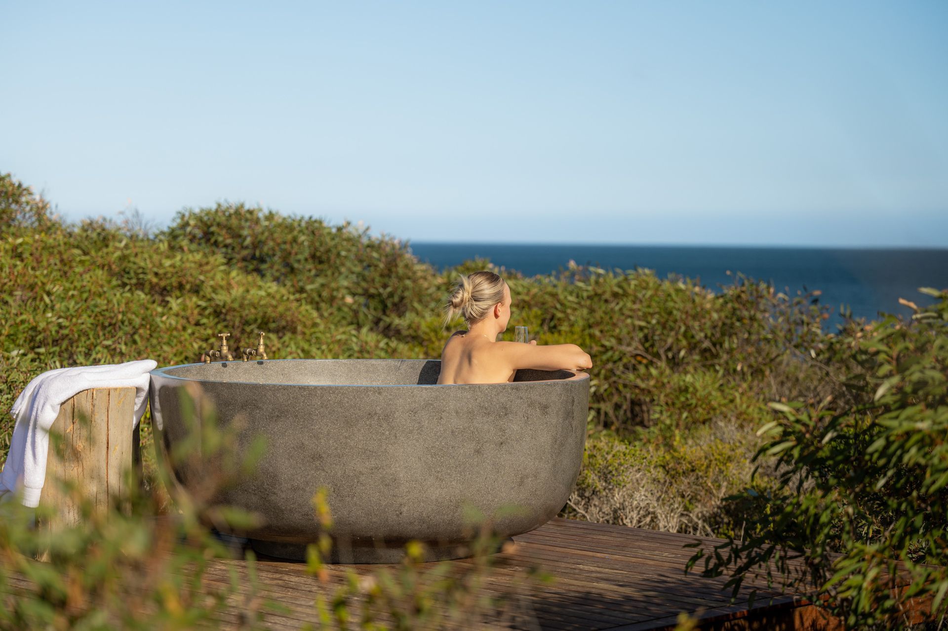 Our Stone Outdoor round bath, specifically positioned for complete immersion and uninterrupted views.